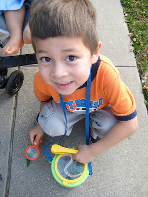 The Big Explorer’s bug container came with plastic tweezers and a magnifying glass and he uses the set to collect all sorts of outdoor goodies (but not bugs for some reason). The magnifying glass helps him get an up-close view of his treasures and the bin gives him a great place to store them. Bug containers cost $10 or less.