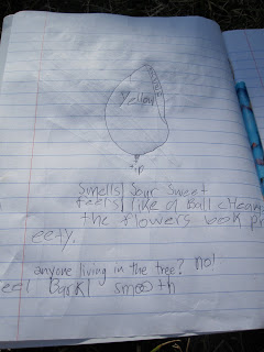 The big explorer took it from here with little to know prompting after that. He sat down to draw a picture of the tree, then a picture of a lemon. He labeled the parts of the lemon and what color each part of the lemon was. He added in some details about how it looked, smelled and felt.