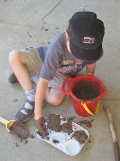 When everyone had mixed up their mud batter to their own personal liking, they began scooping it into their baking cups. (For authenticity, I used actual disposable cupcake trays and liners, which cost me about $3.) The big explorer was very hesitant to use his hands, trying a shovel instead. But finally, he gave in.