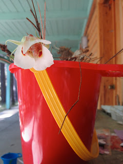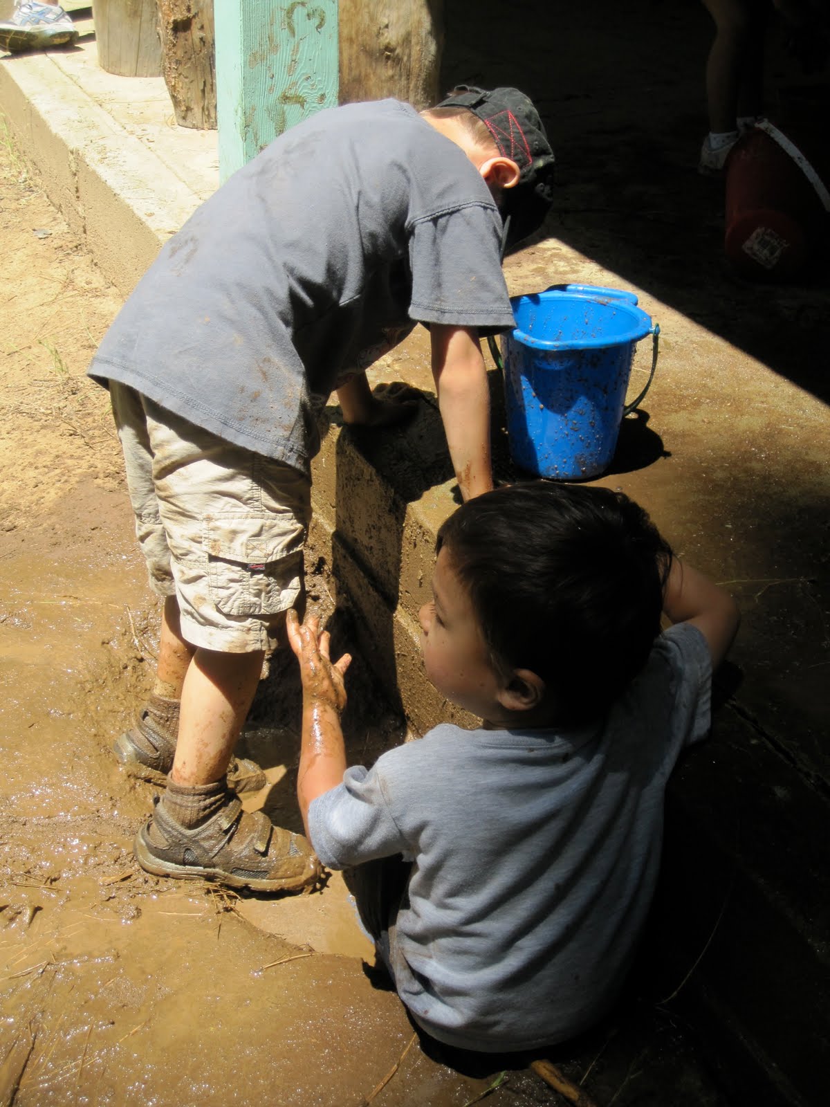 The next step was to mix up some mud. The kids filled their buckets with water, then went off in search of dirt. They used sticks of their choosing to create just the right thickness for their mudcakes.