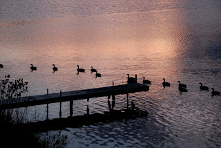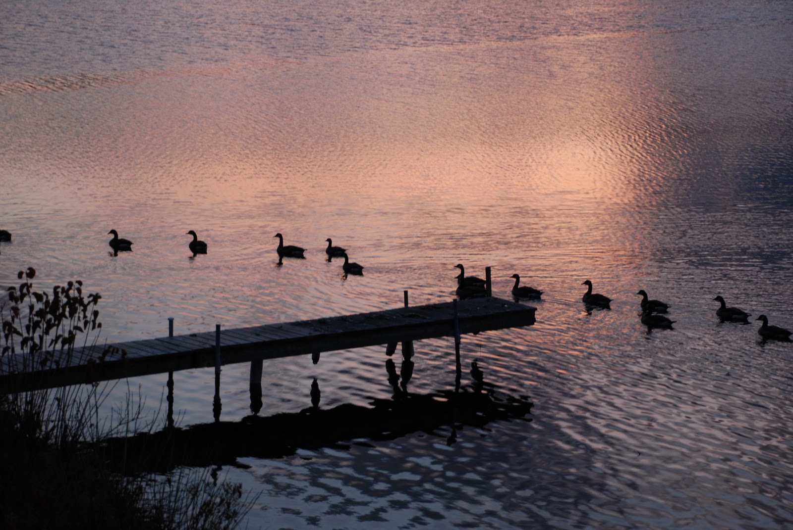 Geese cruising by a dock while enjoying a Rhode Island sunset