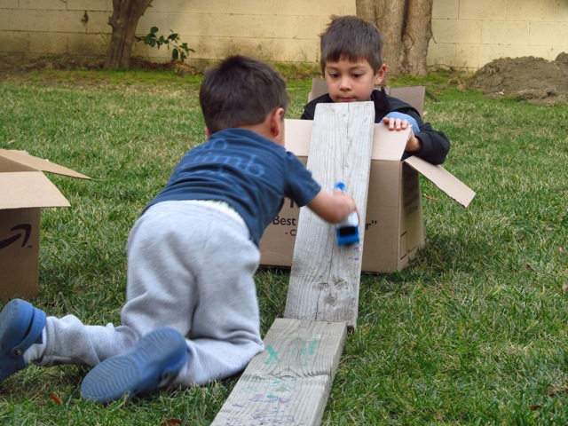 Soon they were adding sticks, wood planks and toy trains to the adventure, laughing so hard they often fell right out of their boxes. (Okay, it was really just The Little Explorer who had trouble staying aboard.)