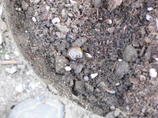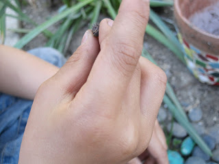 Then we noticed an overturned pot lying in the dirt. I asked the kids what might be underneath it. Of course, the 5 year old didn’t wait to answer, lifting the pot immediately. What did we find?