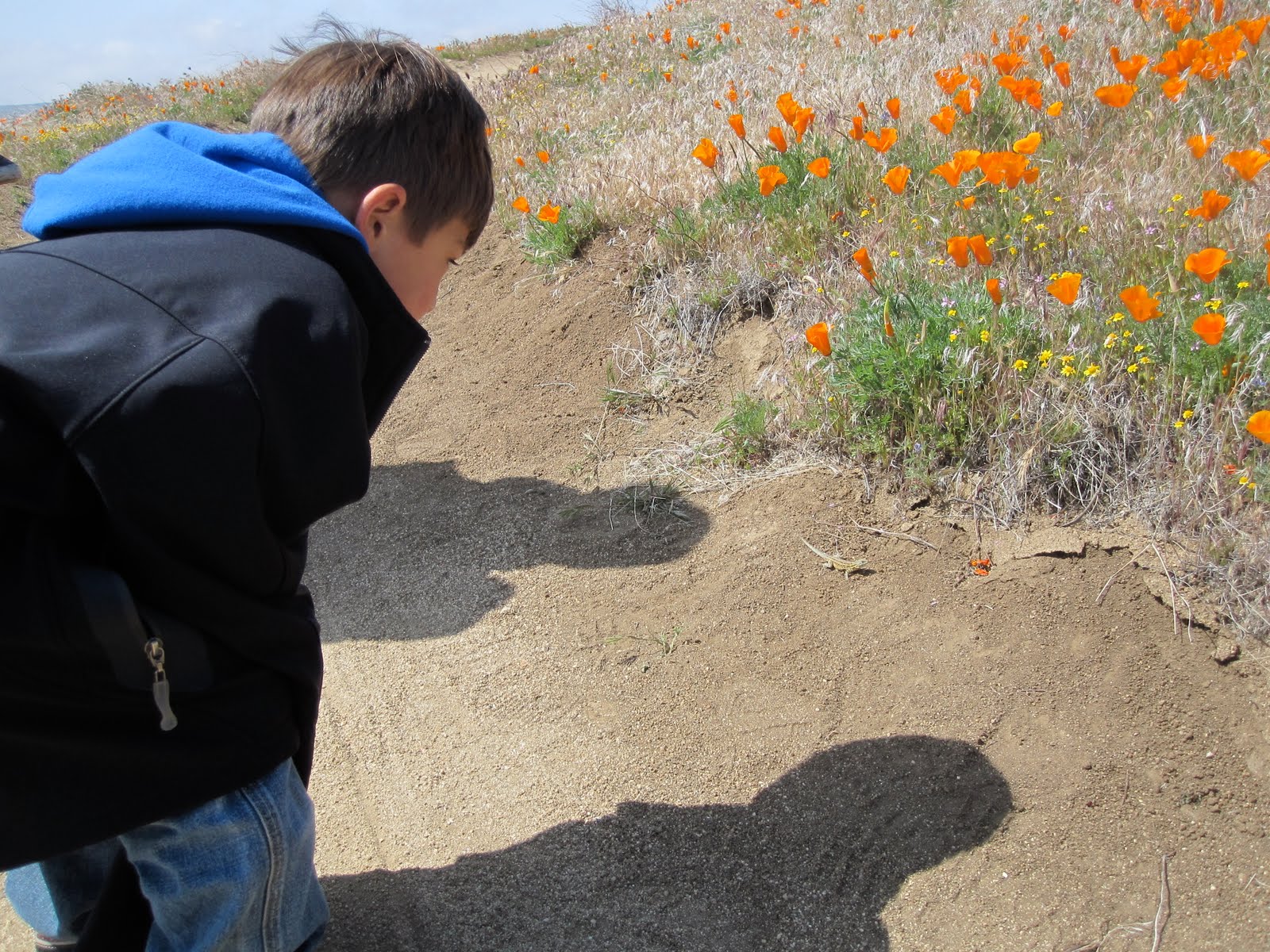 Their fascination with the stuffed animals gave the hubby and I the opportunity to lay down some ground rules for our visit: Don’t touch the poppies. Don’t walk on the flowers. And stay close together on the trail. Keep an eye out for rattlesnakes.