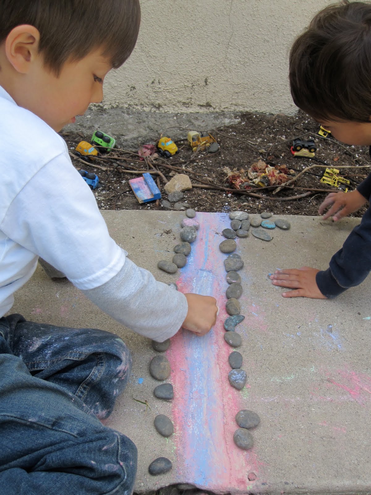 Since realizing that the little explorer is somewhat of a budding artist (or at least, he loves to color), I’ve been looking for fun ways to bring that joy outdoors. The result? We took the crayons outside and looked to nature for inspiration. We’ve also been creating our fair share of chalk drawings right in our own backyard. And lately the kids have taken to incorporating natural objects into their art. Cool stuff!
