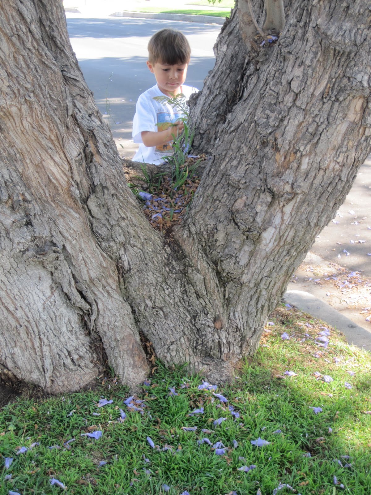 After our second match, we headed to the third tree. The big explorer was excited because the piece of bark we needed to match belonged to his favorite tree, his “sitting tree.” I was thrilled because this particular tree also has the loveliest lavender blooms. We sat together here for a while, he sitting in his special place and me admiring the beautiful flowers.