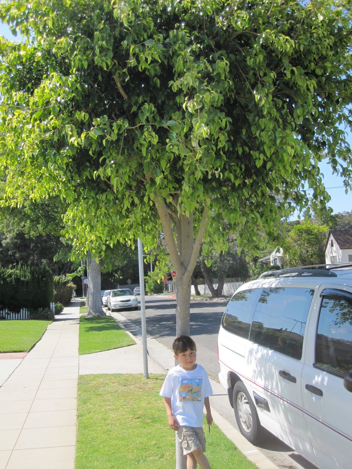 Ever since our adventure exploring a tree in our front yard, the big explorer has been all about trees. So he was more than willing to whisk me out the door earlier this week to try to find each of the trees for which we had bark.