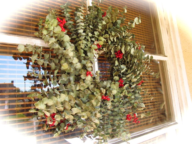 Our live eucalyptus wreath and poinsettias are a happy greeting each time I see my front porch.