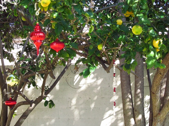 Thanks to some hand-me-down ornaments from my step-mom, we’ve added some bling to the two trees in our backyard.